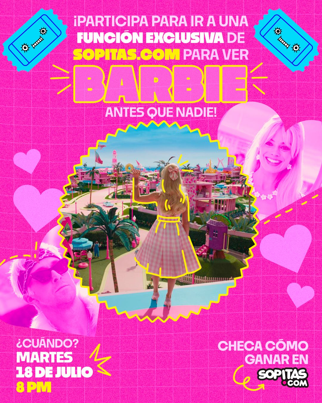 Sigue todas las redes sociales de Sopitas (Facebook, Twitter e Instagram) y de Sopitas FM (Facebook, Twitter e Instagram). Este paso es indispensable.Suscríbete al newsletter de Sopitas.com. Aquí te puedes suscribir por si aún no lo estás.Comparte esta nota en tu cuenta de Twitter con #BarbieXSopitas, mencionando que participas en esta dinámica. Recuerda que tu cuenta debe ser pública para que podamos revisar tu tuitazo.Responde las siguientes preguntas: ¿Cómo se llama la empresa que fundó la creadora de Barbie para ayudar a pacientes con cáncer de mama? ¿Cuál fue la primera profesión de Barbie? ¿Cuál fue la petición de Margot Robbie para filmar la película?Déjanos tus respuestas a las preguntas anteriores en ESTE ENLACE y completa los datos personales que te solicitamos (para contactarte si es que resultas ganador).