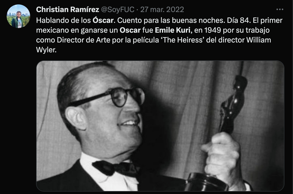 El mexicano pionero en ganar un premio Oscar fue Emile Kuri, quien se llevó el reconocimiento a Diseño de Producción por la película The Heiress, de 1949. Posteriormente, en 1954, consiguió otro Oscar por la cinta Twenty Thousand Leagues Under the Sea’