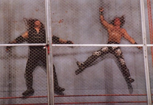 Mankind entró primero a la lucha y de inmediato se subió a la parte alta de la reja, ahí esperó al Undertaker que tampoco dudó en subir. Después de unos cuantos minutos de batalla, sucedió algo que hasta la fecha sigue asombrando.