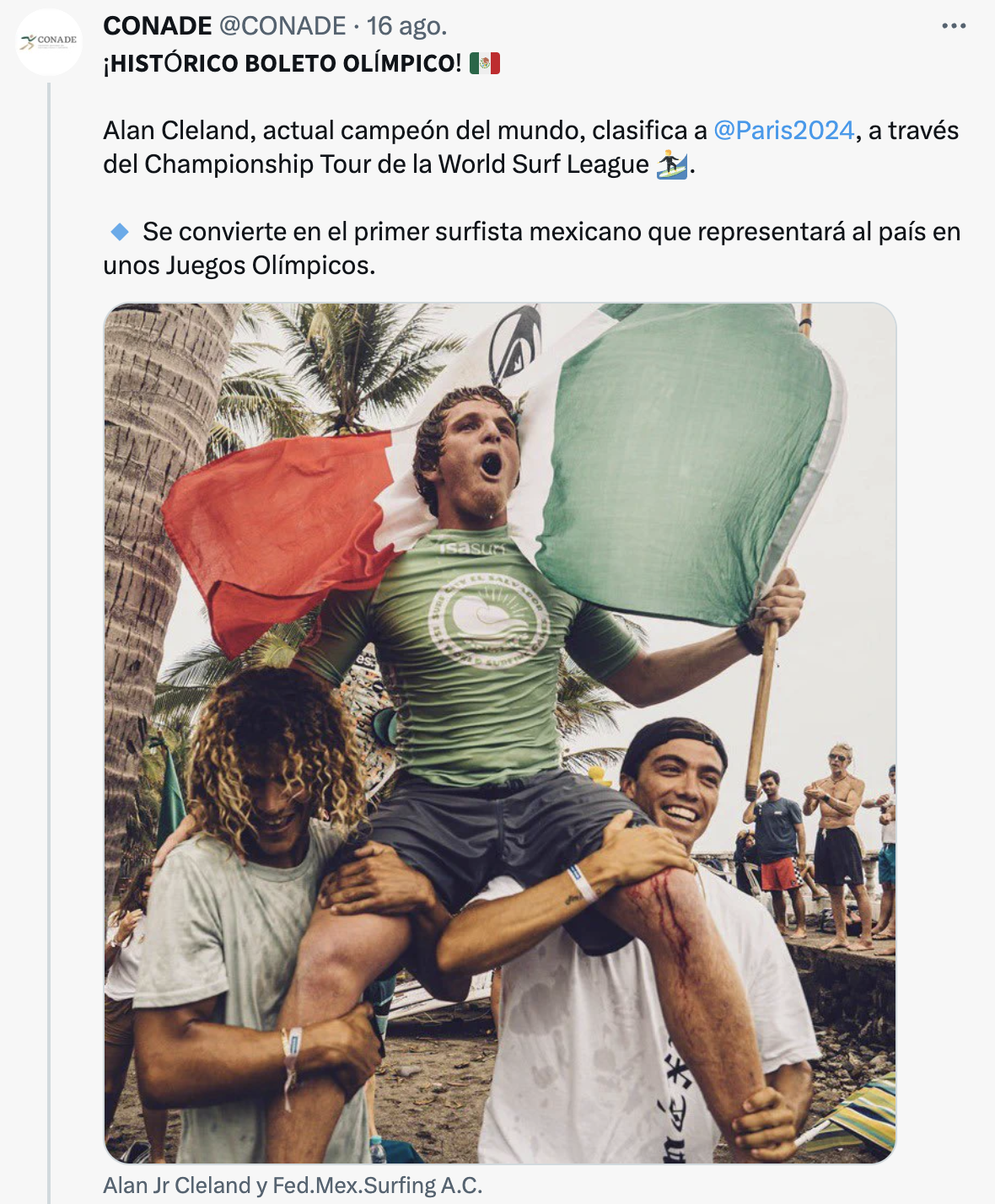 Pero ni siquiera fue necesario ir por ese boleto a los Juegos Panamericanos. Un recorrido de lugares que realizó la Asociación Internacional de Surf (ISA, por sus siglas en inglés) tras los resultados del WSL Championship, confirmó el lugar del surfista mexicano en los Juegos Olímpicos de París 2024 gracias a ese triunfo en El Salvador.
