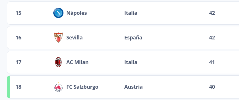 Un ejemplo claro de esto es el Salzburg, de Austria, equipo que solo pasó a octavos de final en una de las cuatro Champions entre 2021 y 2024, las demás no superó ni la fase de grupos. Pero jugará el Mundial de Clubes por ser el número 18 del ranking UEFA, dejando fuera a equipos como Milan, Barcelona o Liverpool, gracias a ese límite de equipos por país que impide que algún otro equipo de España, Alemania, Inglaterra o Italia vayan en su lugar.