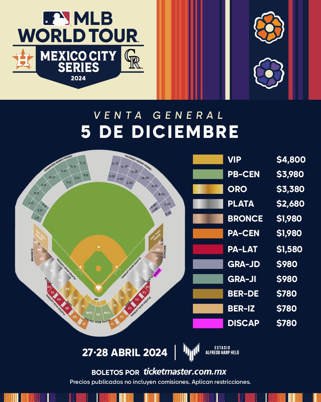 Los precios para los partidos entre Astros y Rockies van desde los 780 pesos, que corresponde a la zona de gradas sin asientos y para personas discapacitadas, mientras que los boletos más caros ascienden a los cuatro mil 800 pesos en la zona VIP.