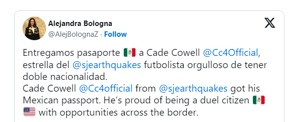 Como seguro imaginas, sí, Cowell tiene la doble nacionalidad porque tiene ascendencia mexicana. De hecho, este 4 de enero la embajadora de México, Alejandra Bologna, presumió la entrega de su pasaporte al jugador nacido en Estados Unidos, a quien describió como un “futbolista orgulloso de tener doble nacionalidad”.