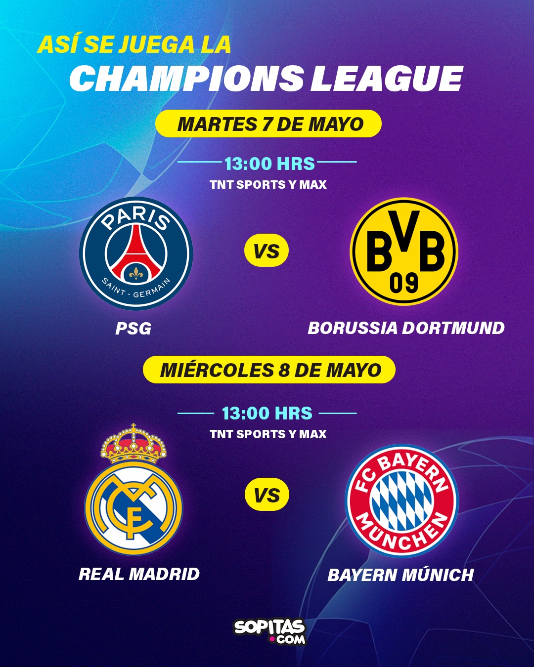 Real Madrid vs Bayern MúnichSantiago Bernabéu13:00 hrsTNT Sports y Max
