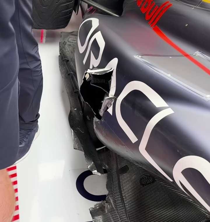 Checo se tuvo que retirar de la pista porque comenzó a perder agarre con la parte trasera del coche y no era para menos, tenía un agujero enorme en el costado derecho del RB19 que afecto el pontón y el piso, no había manera de poder continuar para el mexicano.