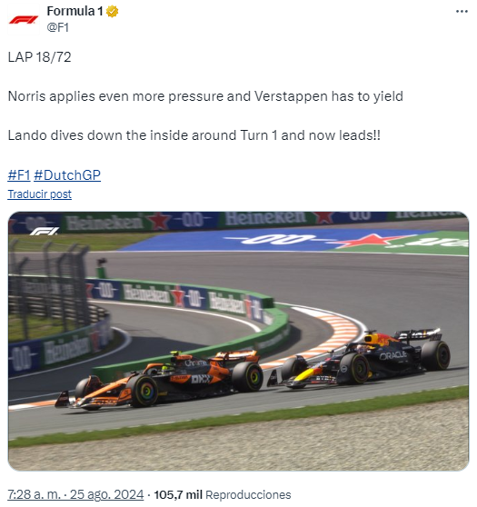 El rebase de Lando Norris para tomar el liderato del Gran Premio de Países Bajos