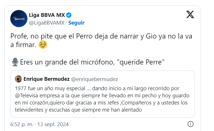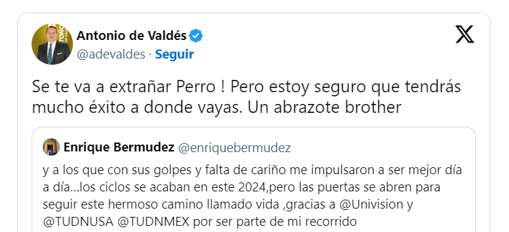 Enrique “El Perro” Bermúdez compartió un mensaje de despedida anunciando su salida de Televisa, dando las gracias tanto a Univisión Deportes como a TUDN USA y México. ¡Nooooooooo!