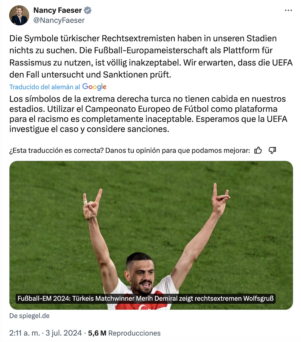 En el caso de Alemania, la ministra del Interior Nancy Faeser reclamó en Twitter —X— a la UEFA que las canchas de futbol alemanas no pueden servir como plataforma para el racismo, además de pedir que investigara el caso y aplicara hasta sanciones.