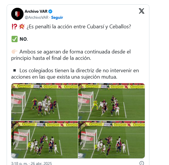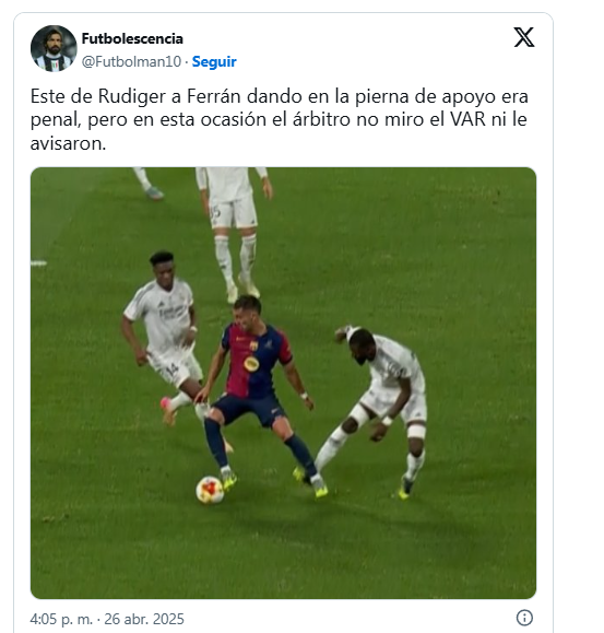 Y pues no, la polémica arbitral no faltó, pues la afición del Barcelona reclama dos penales no marcados por el central. Primero con el agarrón de Ceballos a Cubarsí, evitando que empujara el 2-0 con la posición ganada en una jugada dramática que se fue al poste. Ya en el segundo tiempo, vino un golpe leve de Rüdiger sobre Ferran, leve pero suficiente para mandarlo al césped. El VAR no intervino en ninguna de las dos jugadas.