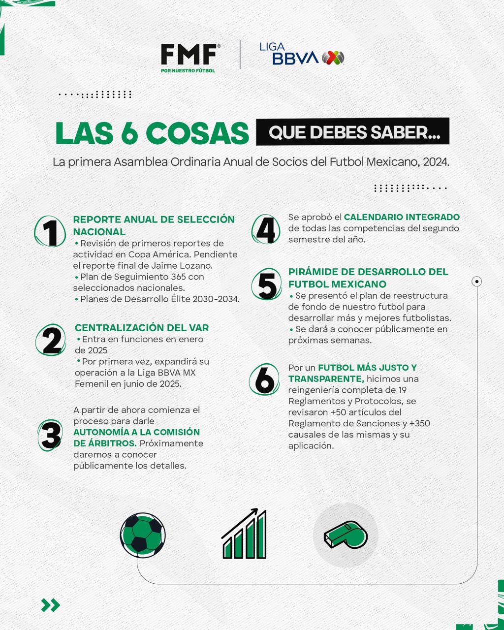 En cuanto al VAR, por ejemplo, se acordó la centralización del mismo en la FMF, además de que se integrará de forma completa en la Liga MX Femenil a partir de 2025 (actualmente se usa solo en la liguilla).