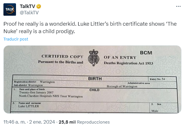 Pero ese no es el caso de The Nuke. Luke Littler sí tiene 17 años y en redes sociales se encargaron de confirmarlo. Distintos usuarios compartieron su certificado de nacimiento, donde vemos que nació el 21 de enero de 2007.