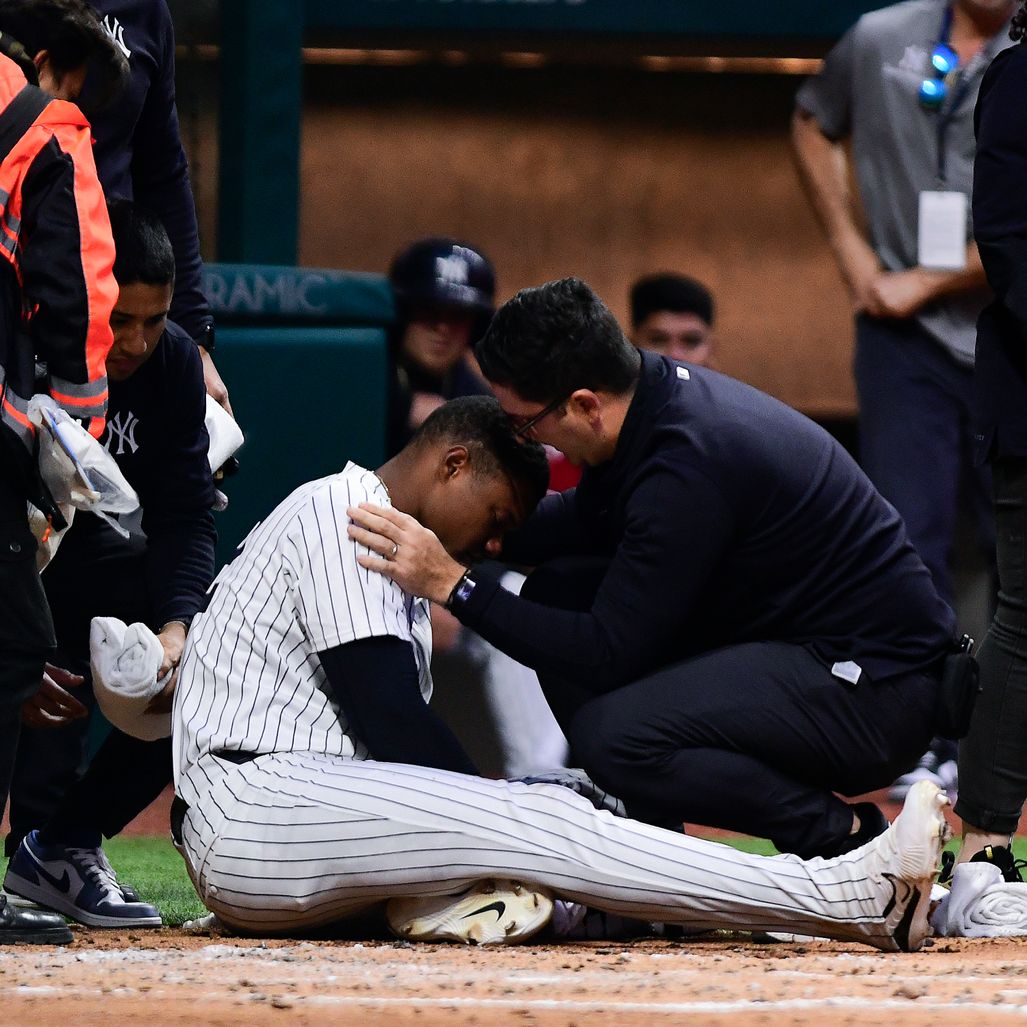 El jardinero de los Yanquis de Nueva York, Óscar González, sufrió una fractura orbital derecha y permanecerá en la Ciudad de México para una evaluación adicional después de que una pelota de faul le pegó en la cara en la segunda entrada