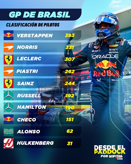Con las posiciones que obtuvieron el Gran Premio de Brasil, Lando Norris sumó 8 puntos y llegó a 331 en total; Max Verstappen, por otro lado, sumó 26 puntos y queda con 393.