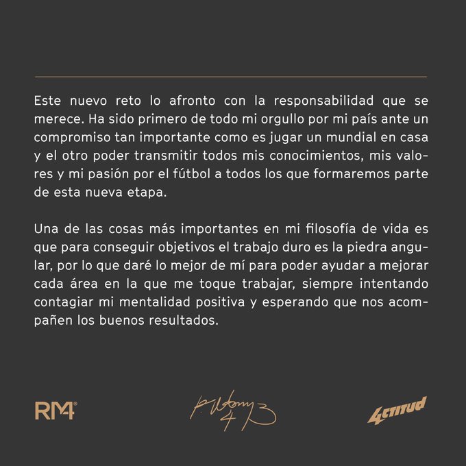 “Ha sido primero de todo mi orgullo por mi país ante un compromiso tan importante como es jugar un Mundial en casa y el otro poder transmitir todos mis conocimientos, mis valores y mi pasión por el futbol a todos los que formaremos parte de esta nueva etapa”, argumentó.