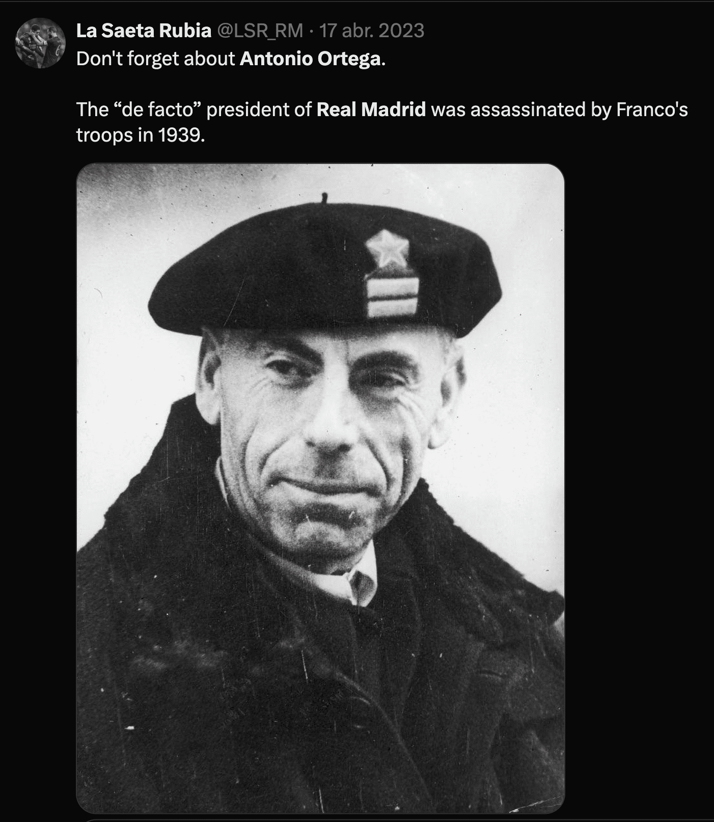Antonio Ortega, coronel republicano y comunista que luchó en la Guerra Civil, fue ejecutado por el franquismo cuando era presidente interino del equipo en 1939.