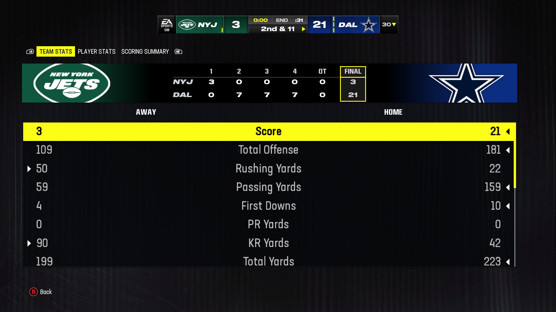 ¿Qué sucedió según el ‘Madden 24’? Bueno, lo que la mayoría podría pronosticar, una victoria para los Cowboys. El videojuego le dio el primer cuarto a los Jets, pero su ofensiva no supo caminar con Zach Wilson.