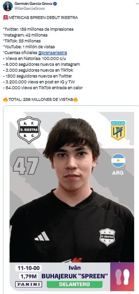 El tema es que mucha afición no tomó nada bien el debut de Spreen con Riestra. Las críticas se enfocaron principalmente en la lucha, esfuerzo y sacrificios que hacen miles de niños y jóvenes por el sueño de debutar algún día en Primera División, y Spreen cumplió eso solo por ser streamer y como parte de una campaña de marketing.