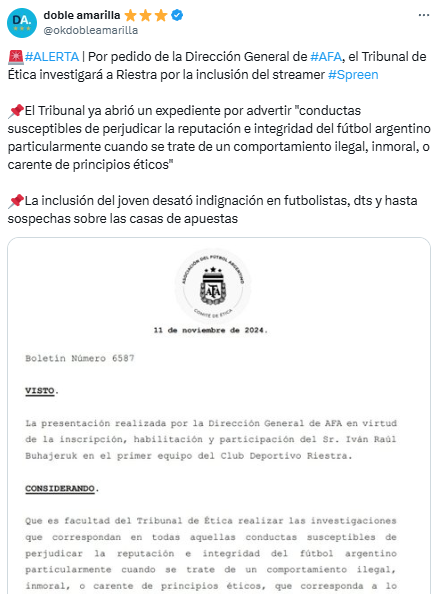 “Es facultad del Tribunal de Ética realizar las investigaciones que correspondan en todas aquellas conductas susceptibles de perjudicar la reputación e integridad del futbol argentino, particularmente cuando se trate de un comportamiento ilegal, inmoral o carente de principios éticos”, indica el comunicado difundido por el portal doble amarilla.
