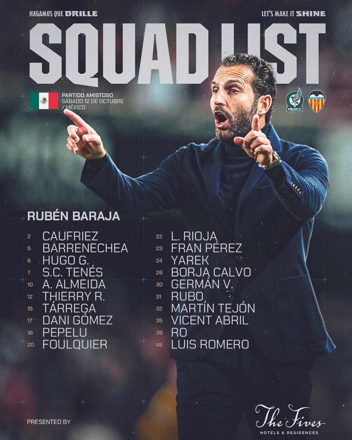 Durante la Fecha FIFA de octubre, Valencia aportó varios jugadores a selecciones no sólo a las mayores, sino a representativos con límite de edad, como Sub 23, a lo cual hay que sumar bajas por lesión, de modo que el equipo español jugará en México con sólo 13 futbolistas del primer equipo, y el completará su plantel con elementos de sus equipos inferiores.