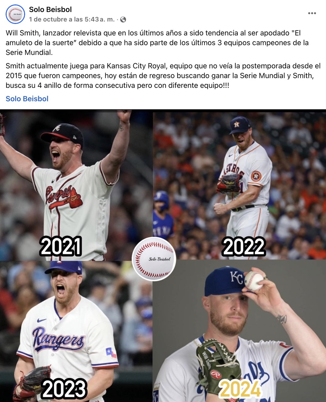 Y es que por acá nos topamos con una publicación de la página Solo Beisbol, donde vemos varias fotos de Will Smith celebrando con Atlanta Braves, Houston Astros y Texas Rangers en diferentes años. ¿Y qué tienen en común esas fotos y esos equipos? Pues sí, que se trata de los últimos tres campeones de la Serie Mundial en la MLB.