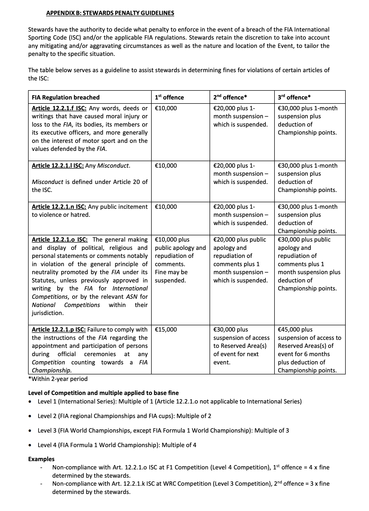 - La tercera infracción se castiga con una multa de 45,000 euros, suspensión de acceso a las zonas reservadas del evento durante 6 meses, y deducción de puntos del Campeonato.