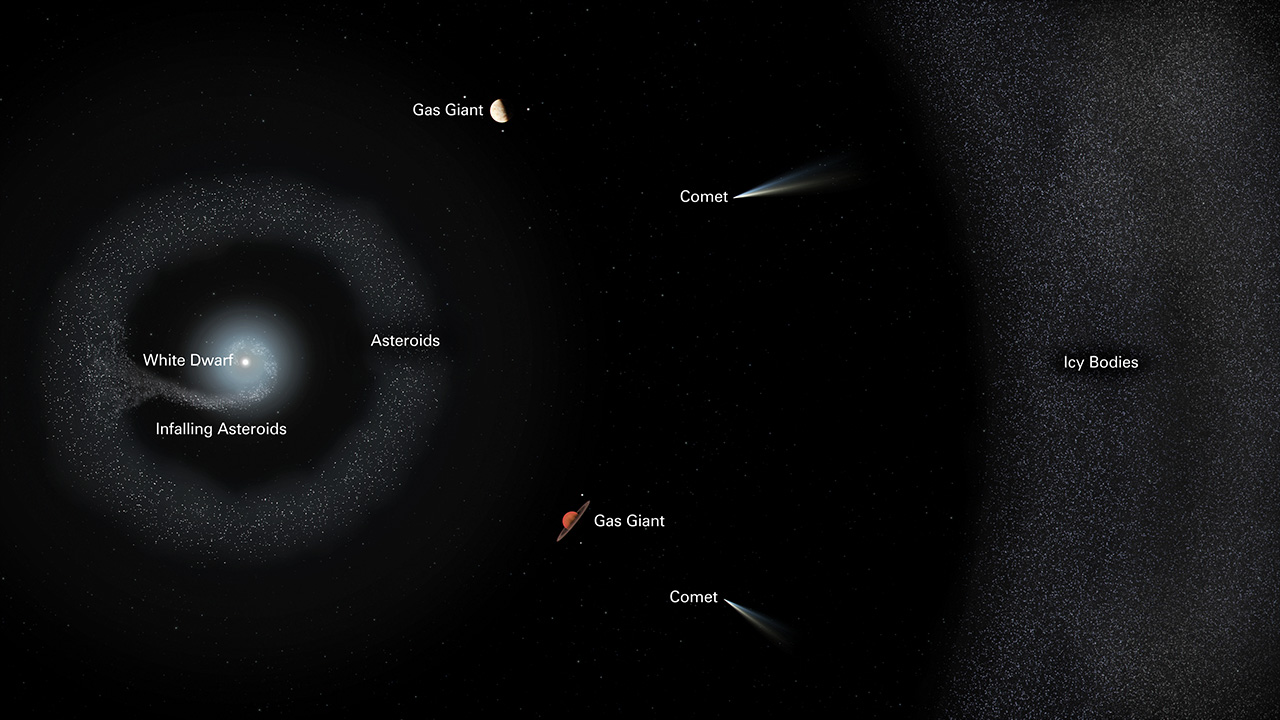 Todos los asteroides y cuerpos planetarios que quedan “vivos” forman una reserva de material que rodea a la estrella y aunque es posible que en el sistema existan planetas gigantes gaseosos más grandes, a lo lejos aún queda un cinturón de cometas que podrían alimentar a la estrella muerta a últimas.