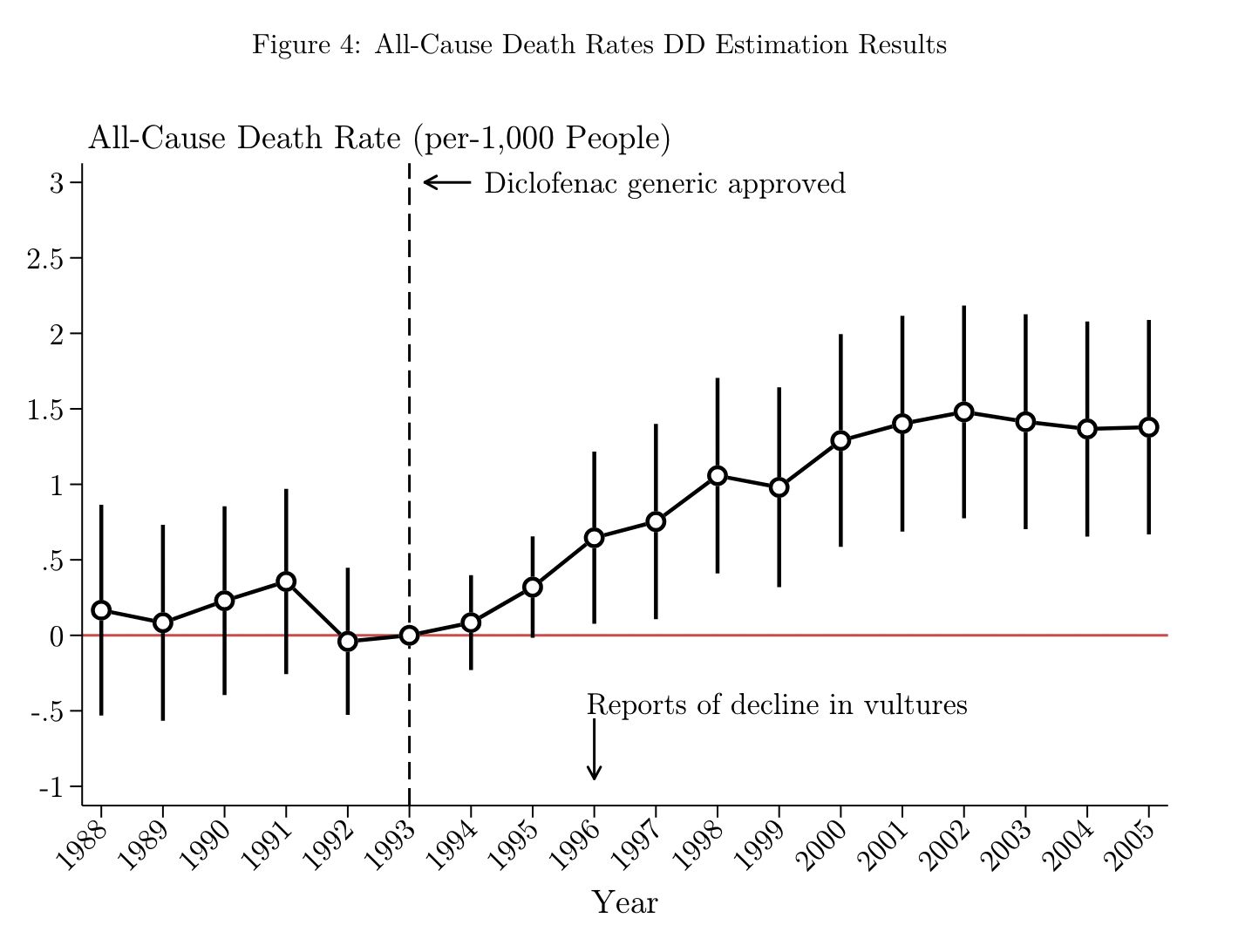Los resultados de la investigación sugieren que la extinción funcional los buitres aumentó la mortalidad humana en más del 4% debido al impacto negativo en el saneamiento.