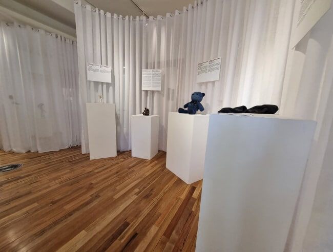 La exposición se presenta en una atmósfera a base de muros, mostradores y cortinas blancas, la que podría recordar a un hospital. Y se puede decir que la muestra es eso, un sanatorio para los corazones rotos.