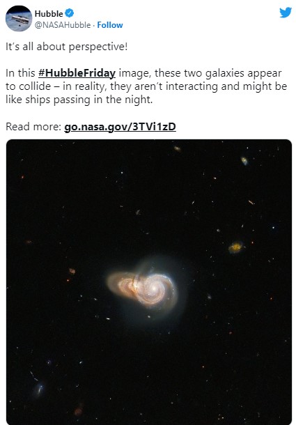 La agencia estadounidense compartió la espectacular imagen a través de las cuentas oficiales del Telescopio, pero una vez que se empezó a viralizar la idea de que era la foto de dos galaxias chocando, aclaró en un comunicado que no se tiene certeza de que en realidad haya sido así. Se trataría únicamente de una cuestión de perspectivas.