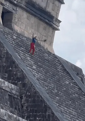 En un primer video podemos apreciar como la ahora llamada ‘Lady Chichen Itza’ –que al parecer era una una mujer originaria de Baja California– subió a la pirámide al saltar y comenzó a burlarse de las personas abajo que la abucheaban por no respetar las reglas del lugar.