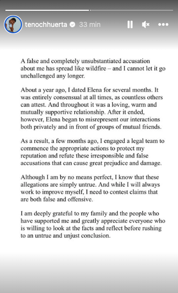 “Sin embargo, después de que terminó, Elena comenzó a tergiversar nuestras interacciones tanto en privado como frente a grupos de amigos en común”, mencionó el actor que aseguró, desde hace meses contrató a un equipo legal para proteger su reputación y ” refutar estas acusaciones irresponsables y falsas que puedan generar daños y perjuicios”.