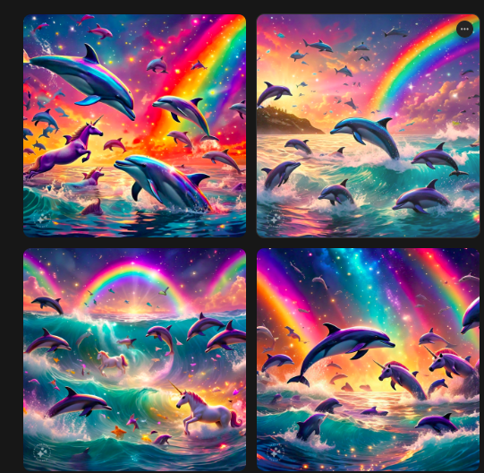 La verdad hay dos caminos: el difícil es dictarle a MetaAI las imágenes que quieres crear. Por ejemplo, nosotros usamos el prompt de “Imágenes de delfines en el mar, junto con unicornios y un cielo lleno de arcoíris. Que tengan mucho brillantina y colores a su alrededor” y nos dio estos resultados: