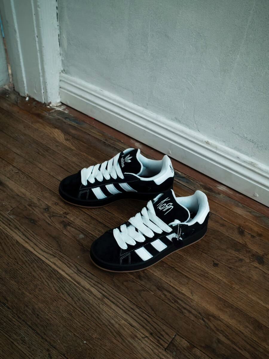 Para empezar, lo que llama la atención de la colaboración de Adidas con Korn son dos pares de tenis. Se tratan de los modelos Campus 00’s y los Supermodified, los cuales vendrán en colores negro y blanco respectivamente, e incluirán detalles impresionantes como el logo de la banda en la lengüeta, llaveros de guitarra y el arte de la portada del disco Life is Peachy en la portada… unas verdaderas joyitas.