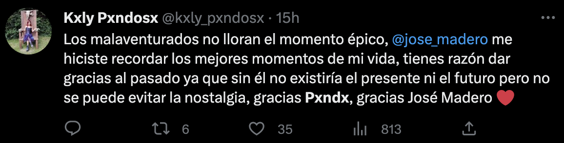 José Madero decidió tocar esta canción como tributo a la banda en la que comenzó su carrera como músico y también, a manera de agradecimiento a los fans que lo han acompañado desde su etapa de PXNDX, pues muchos de ellos estuvieron en el último show de la banda regia.