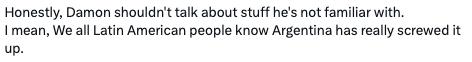 Ahora sí que cada quien, ¿ustedes qué opinan al respecto? Acá les dejamos algunas de las posturas que hemos visto en internet sobre la opinión de Damon Albarn sobre el triunfo de Milei en Argentina: