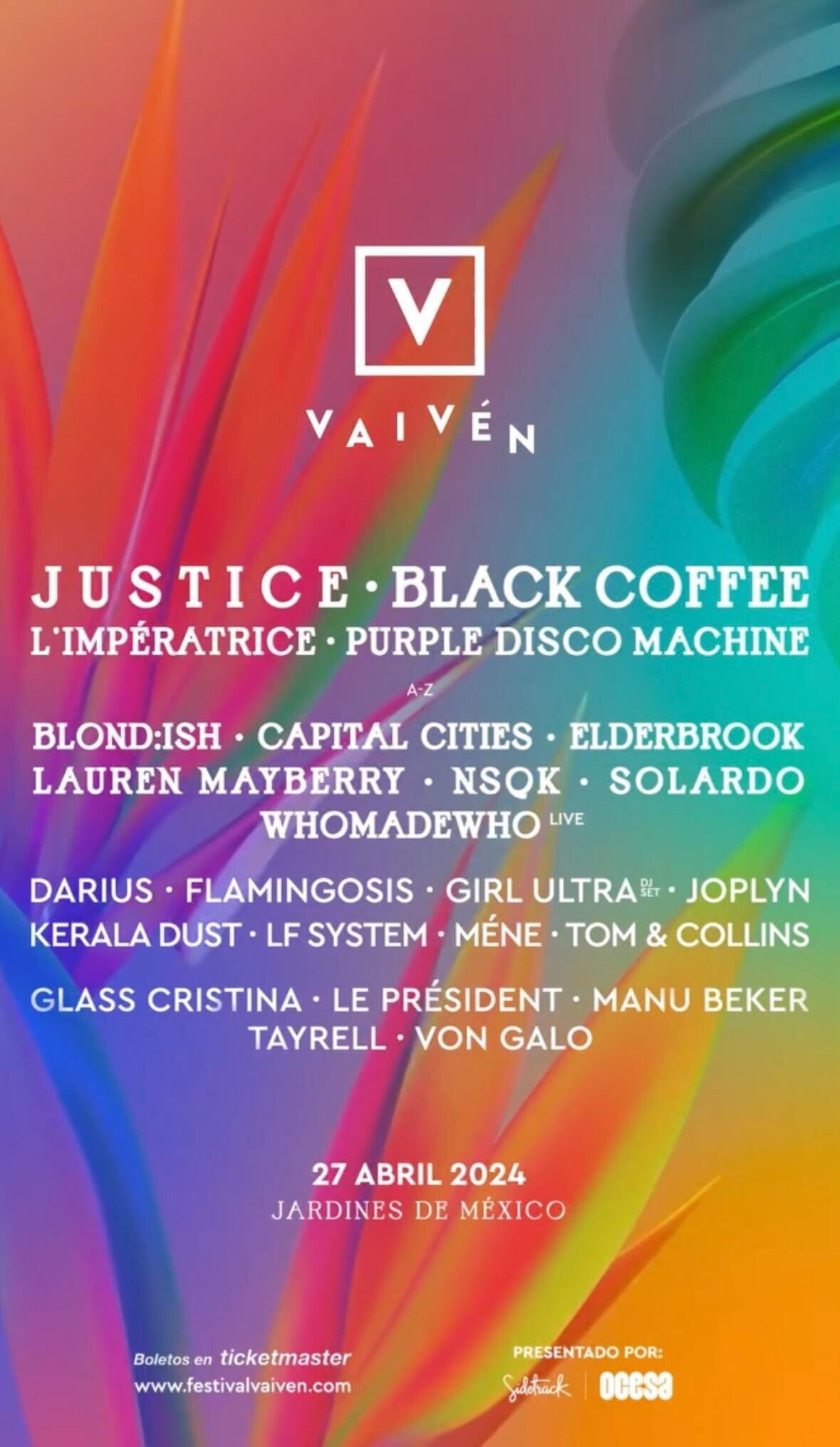 Para que se den una idea de cómo estará el asunto, en esta ocasión el lineup lo encabezan nombres como Justice, L’Impératrice, Purple Disco Machine, Black Coffee, Capital Cities, Lauren Mayberry y muchos más, que seguro armarán un pachangón de aquellos en los Jardines de México. Y para que chequen todo el talento que se presentará en este espectacular venue, acá abajo les dejamos el cartel completito.