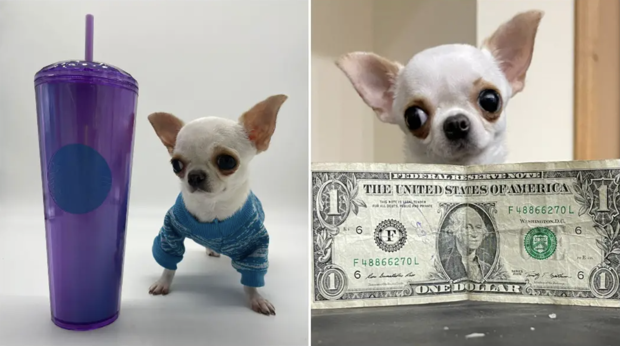 Pearl es una chihuahua de dos años que mide 9 centímetros de alto, 12 centímetros de largo y pesa 553 gramos. Es aproximadamente del tamaño de un billete.