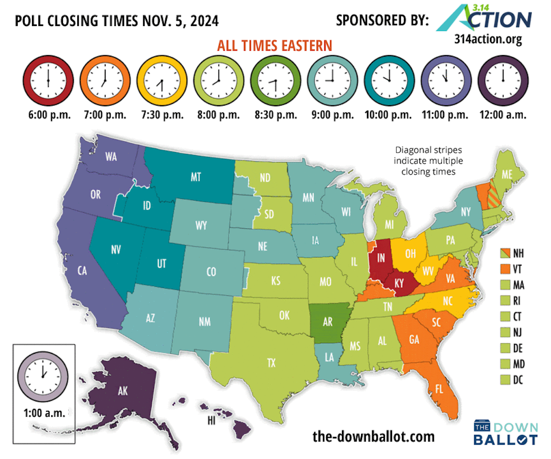 Como parte del enredado sistema electoral en Estados Unidos, cada estado decide a qué hora cierran las casillas. Es una verdadera pachanga: