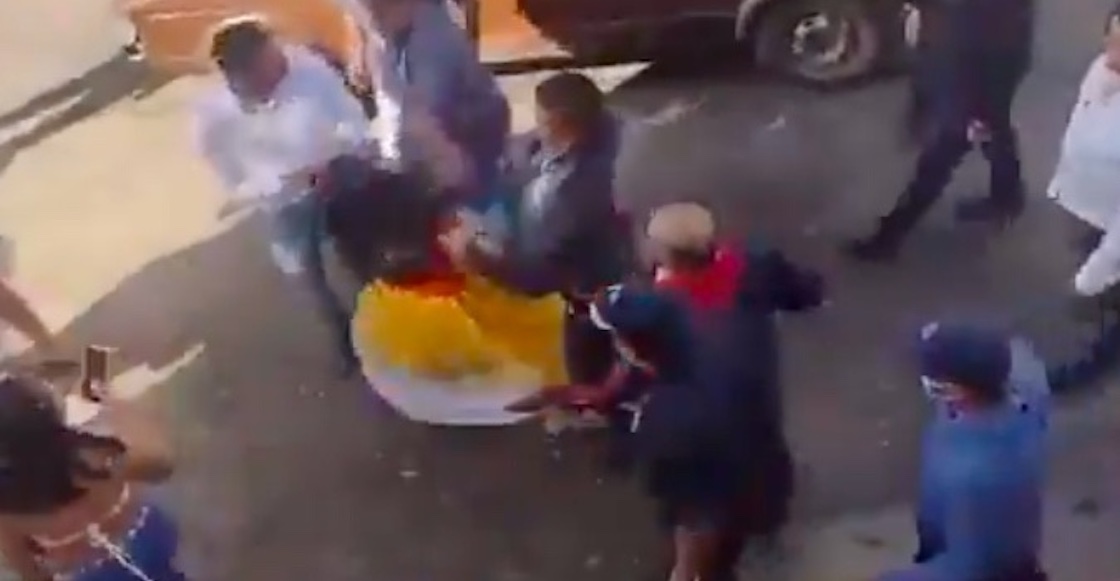 Lo anterior no le bastó al funcionario. Luego de ser encarado, el muy… vuelve a tomar a la mujer del cabello, pero en esta segunda ocasión le mete unos cuantos golpes. Sacados de onda por la cobarde burrada del alcalde, sus acompañantes lo detienen y tratan de alejarlo. Nomás que sin saber que todo fue captado en video por una persona.