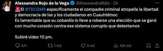 Por su parte, Alessandra Rojo de la Vega dijo que el “compadre criminal” de Monreal se salió con la suya y atropelló “la libertad y democracia de las y los ciudadanos en Cuauhtémoc”. Algo de lo que hablará en un video que lanzará en punto de las 10 de la noche.