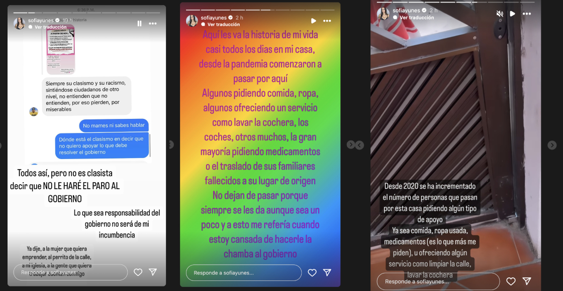 Luego alguien le reclamó en sus historia por clasismo y racismo, a lo que contestó “no mames ni sabes hablar”. Aclaró que no es clasista decir que no le “hará el paro al gobierno” y que lo que sea responsabilidad del gobierno “no será de su incumbencia”.