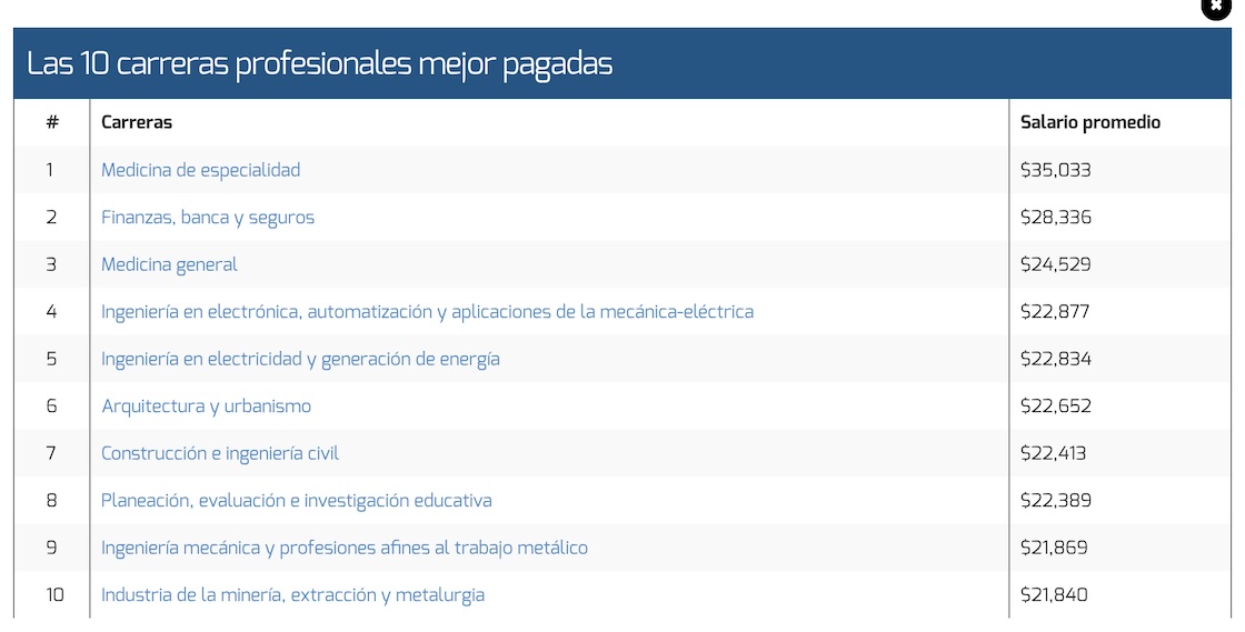 Y de ahí pal real: Arquitectura y urbanismo, Construcción e Ingeniería civil, Planeación, evaluación e investigación educativa, Ingeniería mecánica y profesiones afines al trabajo metálico e Industria de la minería, extracción y metalurgia. Les dejamos la lista con el salario promedio de cada una: