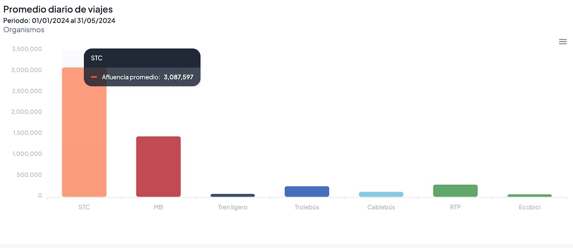 La lista sigue con el Trolebús que transportó en promedio a 251 mil 885 personas, el Cablebús con 118 mil 837, el Tren Ligero con una afluencia de 69 mil 750 y, finalmente, Ecobici con 59 mil 874.