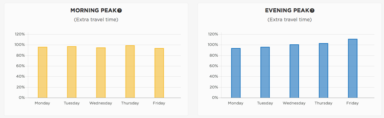 Esto es en comparación con los tiempos de viaje medidos durante condiciones no congestionadas. Lo que se hace es calcular e informar el nivel de cogestión general -todo el día- y los niveles de tráfico en las horas pico por la mañana y por la tarde en cada ciudad.