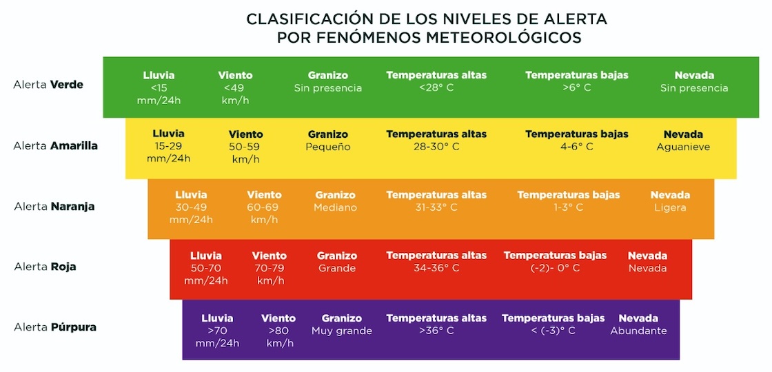 Estos cinco colores corresponden a una lista que clasifica qué tan cañones vienen ciertos fenómenos meteorológicos como las lluvias, el calor, el frío o los vientos y hasta granizadas.