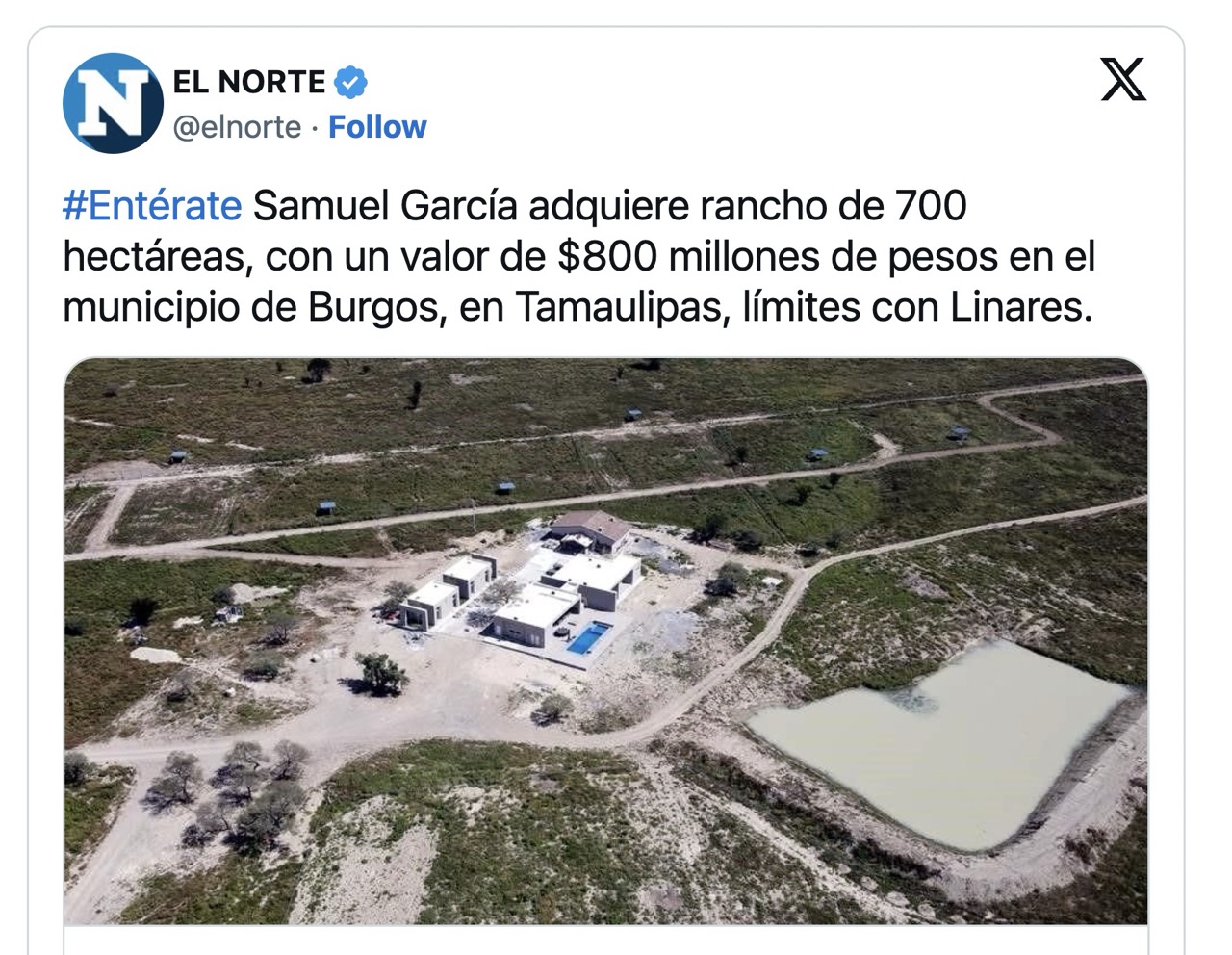 Samuel García anda en el ojo de las redes sociales porque, dicen, se hizo de un terreno muy caro y muy grande: 700 hectáreas con un valor de 800 millones de pesos, para ser precisos (¿será que sí deja eso de ser Gobernador?).