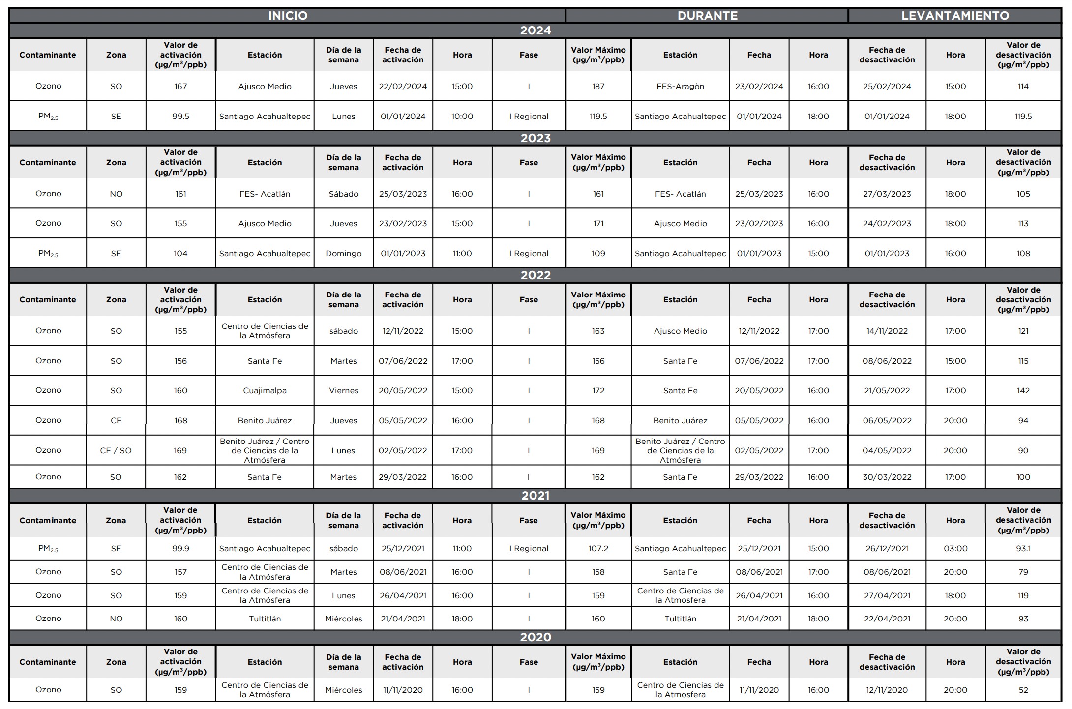 En el 2022 las contingencias por ozono no pasaron de 161 ppb, ni cuando se activaron, ni durante, ni cuando se levantaron. Lo mismo ocurrió en el 2021, ninguna contingencia pasó de 160 ppb ni de dos días. Esto se repite en 2019 y 2018.