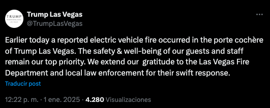 Luego del incidente, el hotel de Trump lanzó un comunicado a través de la plataforma de X donde detalló que el automóvil en cuestión era eléctrico y agradecieron al Departamento de Bomberos de Las Vegas y a las fuerzas de seguridad locales por su rápida respuesta.