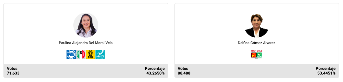 Y acá también ganó la candidata de Morena. Delfina Gómez se llevó 88 mil 488 votos, es decir, el 53.44%, mientras que Alejandra Del Moral se quedó con un 43.26%, lo que representa 71 mil 633 votos.