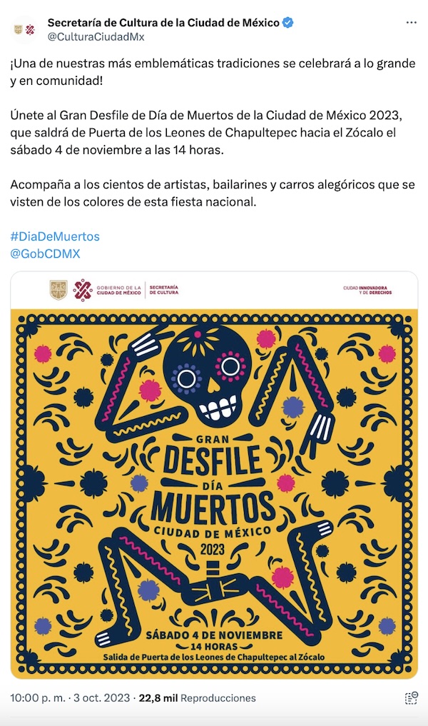 Ok. Va de nuevo: la cita para asistir al gran Desfile del Día de Muertos 2023 en CDMX será el sábado 4 de noviembre en el Bosque de Chapultepec, a partir de las 2 de la tarde.